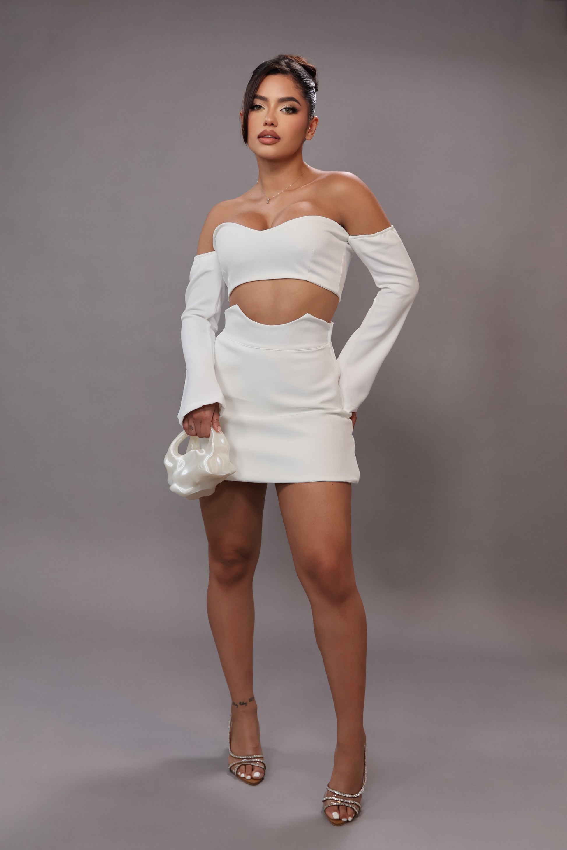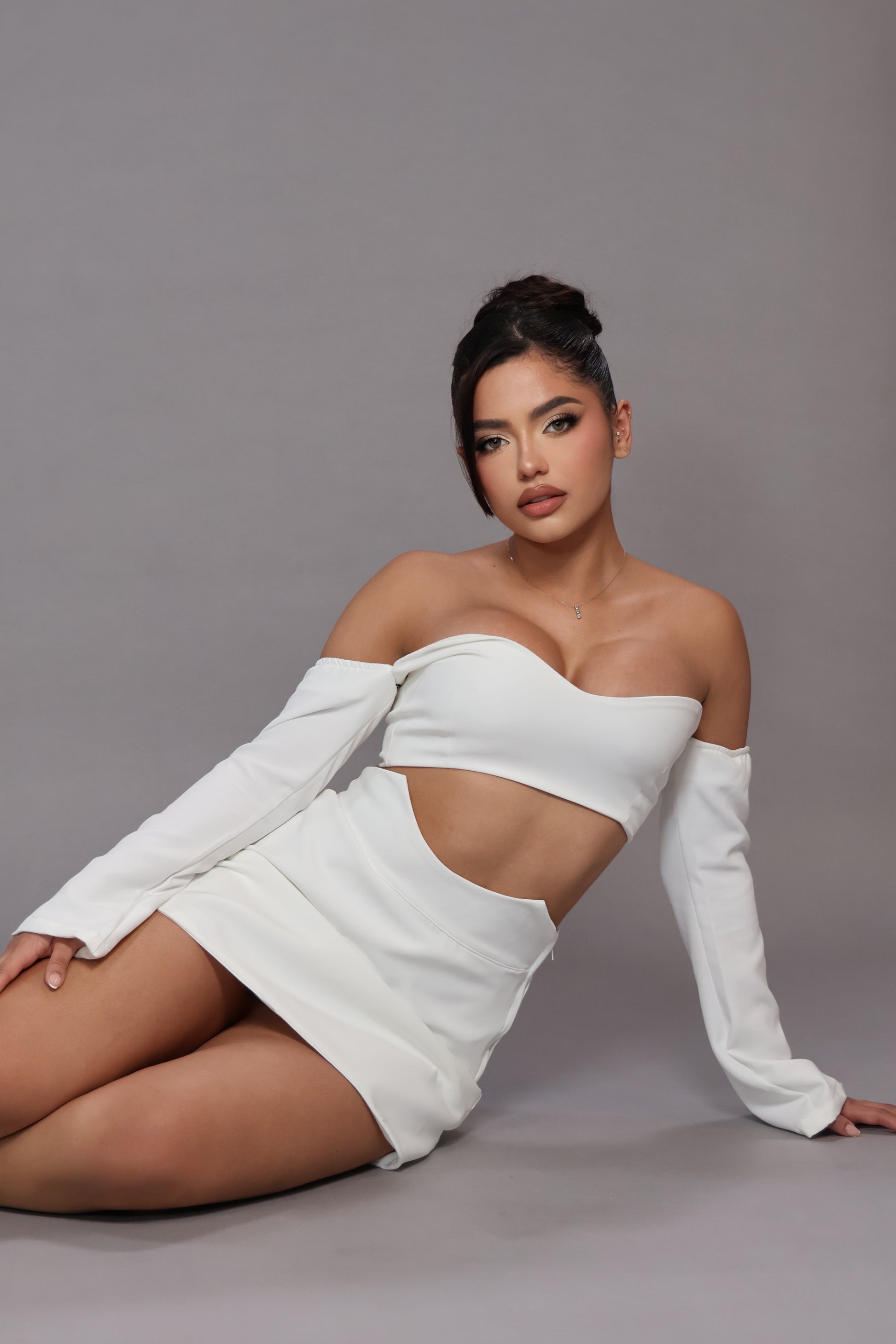 Set blanco compuesto por top strapless de manga larga y falda corta de tiro alto, diseñado con cortes estratégicos que resaltan la silueta de manera sutil y moderna. Una propuesta fresca y femenina perfecta para destacar en cualquier ocasión especial.