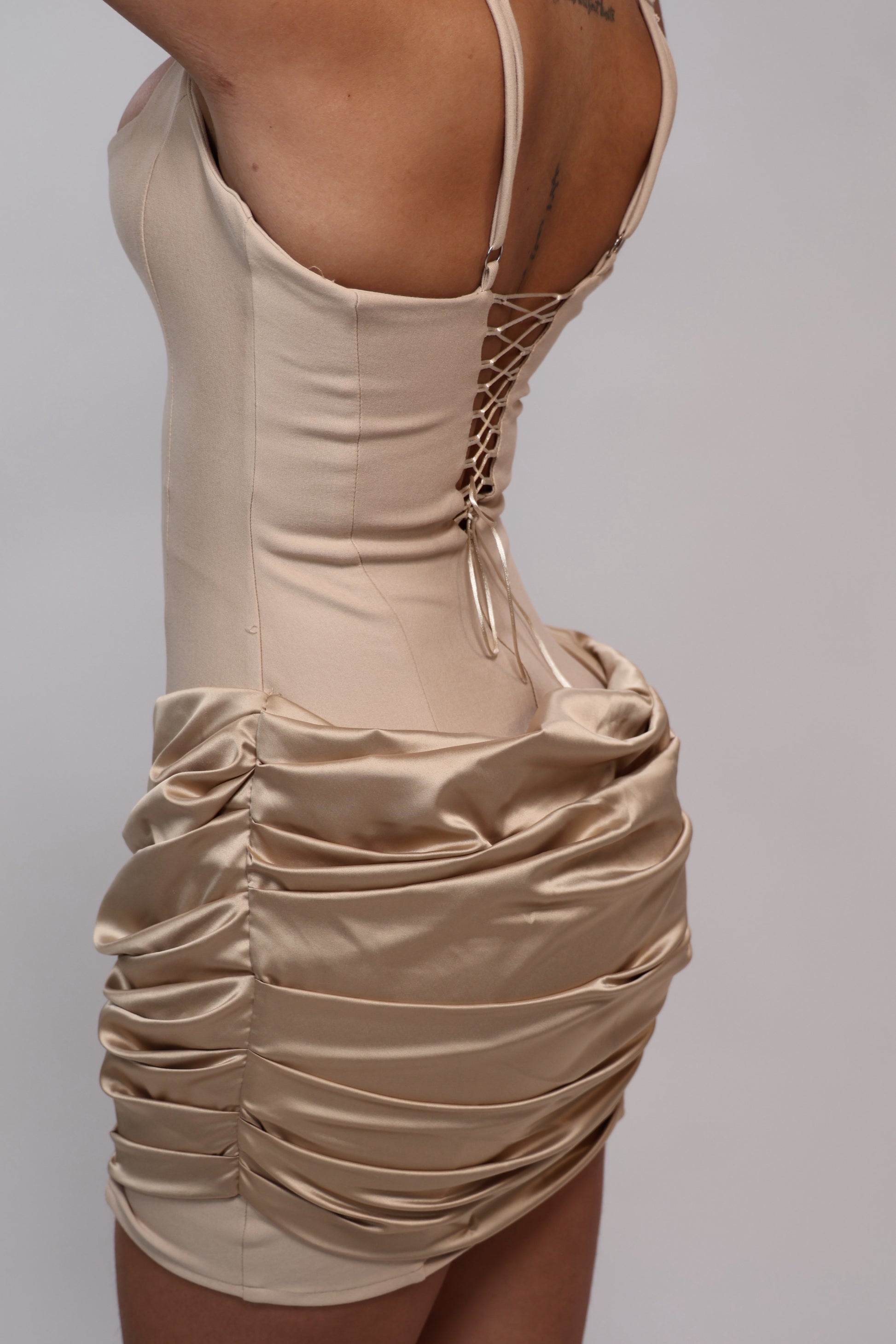 Vestido corto en tono dorado con diseño drapeado en la falda que aporta textura y movimiento. El cuerpo ajustado resalta la figura, creando un equilibrio perfecto entre sensualidad y elegancia.